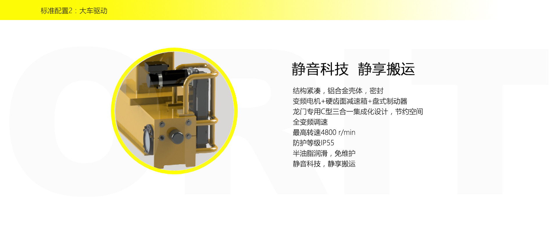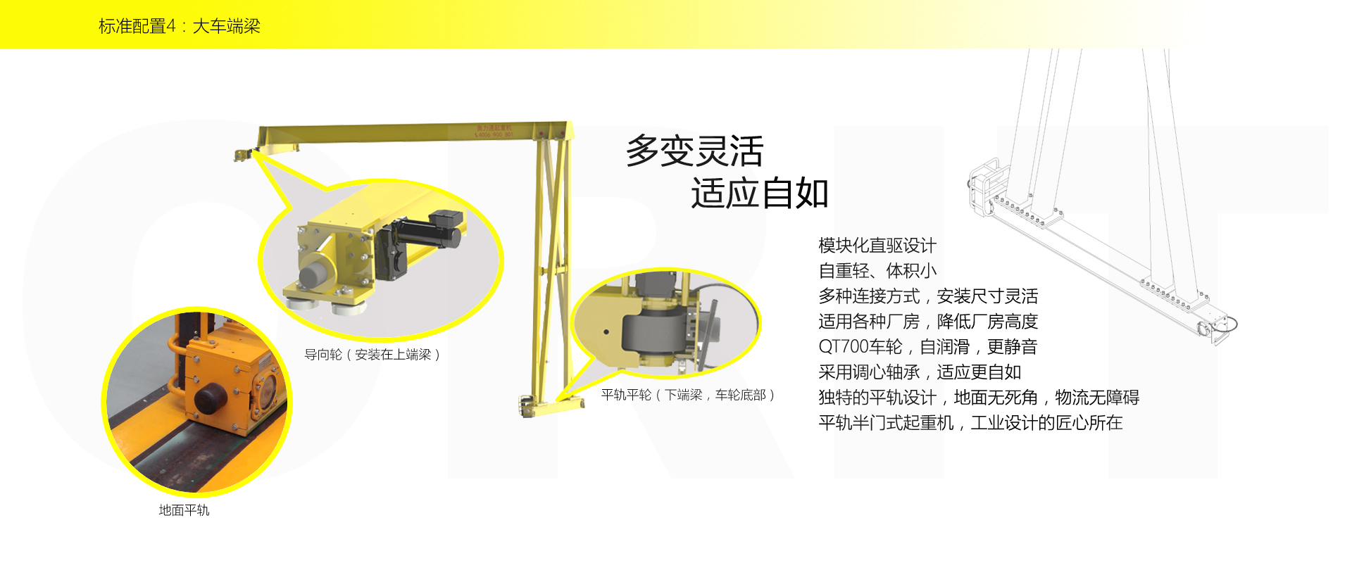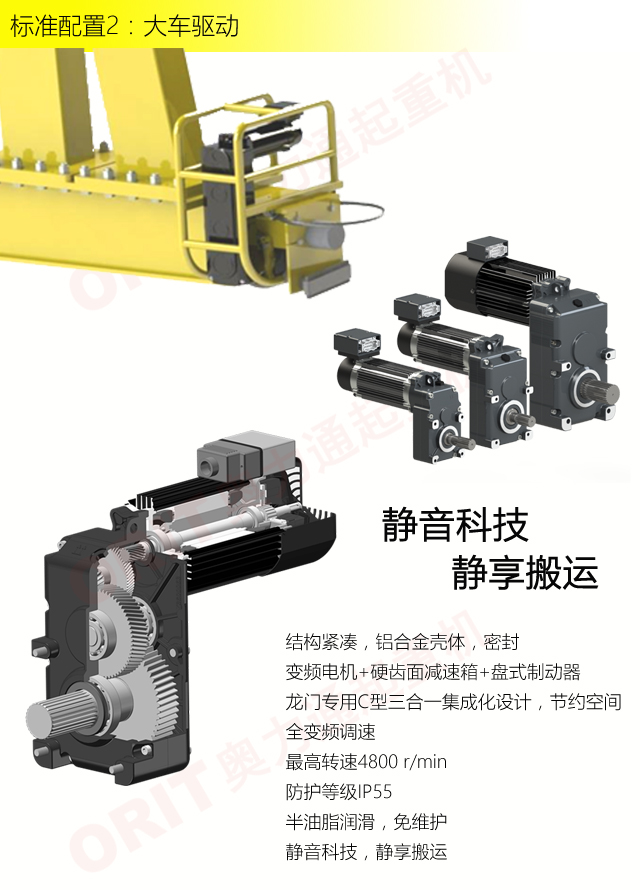 產(chǎn)品名稱:半門式起重機(jī) 優(yōu)化設(shè)計(jì),結(jié)構(gòu)緊湊 變頻控制,運(yùn)行平穩(wěn) 實(shí)時安全監(jiān)控,確保吊運(yùn)安全 龍門吊專用C型驅(qū)動,節(jié)約空間 平軌設(shè)計(jì),地面無障礙 美觀大方,視野開闊,便于物流 標(biāo)準(zhǔn)化配置,讓性能無比穩(wěn)定 適用于12.5t以下額定載荷 標(biāo)準(zhǔn)配置1:起升機(jī)構(gòu) 顛覆傳統(tǒng),自成一體 低凈空設(shè)計(jì) 柔性驅(qū)動,內(nèi)應(yīng)力小,傳動效率高 重級制電機(jī),接電持續(xù)率60%ED 行走變頻無極調(diào)速,運(yùn)行平穩(wěn) 自調(diào)試電磁盤式制動器,可靠,防塵 2160N/mm2 高強(qiáng)度鍍鋅鋼絲繩,免維護(hù) 全周型導(dǎo)繩器,防松繩 全系標(biāo)配安全監(jiān)控系統(tǒng) 標(biāo)準(zhǔn)配置2:三合一驅(qū)動 靜音科技,靜享搬運(yùn) 結(jié)構(gòu)緊湊,鋁合金殼體,密封 變頻電機(jī)+硬齒面減速箱+盤式制動器 龍門專用C型三合一集成化設(shè)計(jì),節(jié)約空間 全變頻調(diào)速 最高轉(zhuǎn)速4800 r/min 防護(hù)等級IP55 半油脂潤滑,免維護(hù) 靜音科技,靜享搬運(yùn) 標(biāo)準(zhǔn)配置3:電控系統(tǒng) 安全隨心掌控 智能安全監(jiān)控器 計(jì)算起升機(jī)構(gòu)剩余安全工作時間 累計(jì)起升工作時間 累計(jì)超載次數(shù) 累計(jì)起升電機(jī)啟動次數(shù) 起升電機(jī)過熱保護(hù)及報警 剎車片厚度報警 ... ... 遠(yuǎn)程通訊 施耐德電氣元件 航空插座接口 IP55防護(hù)等級 標(biāo)準(zhǔn)配置4:端梁 多變靈活,適應(yīng)自如 模塊化直驅(qū)設(shè)計(jì) 自重輕、體積小 多種連接方式,安裝尺寸靈活 適用各種廠房,降低廠房高度 QT700車輪,自潤滑,更靜音 采用調(diào)心軸承,適應(yīng)更自如 獨(dú)特的平軌設(shè)計(jì),地面無死角,物流無障礙 平軌半門式起重機(jī),工業(yè)設(shè)計(jì)的匠心所在
